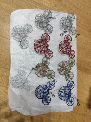 Conjunto de adornos navideños con temática de Mickey Mouse de Disney. Perfectos para decorar tu árbol. -10 Adornos de alambre con forma de cabeza de Mickey 2 plata 2 rojas, 2 doradas 2 azules y 2 blancas. -4 cojines de tela, Mickey, Pooh y Minnie. -1 cabeza de Mickey de tela. -4 bolas 1 discoteca, 1roja de plástico Mickey y Minnie, 1 plástico Mickey Disney world y 1 cerámica blanca,, todos los personajes. -4 figuras de cerámica, Mickey, árbol de navidad, Pluto collar guirnalda, Minnie regalos y zapato cenicienta con ratones Gus y jap -bola puzzle Mickey y Minnie