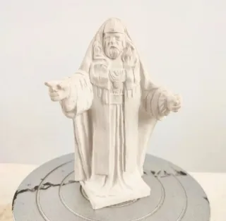 Figura religiosa de escayola pintada a mano. Representa a un santo con mitra y capa. - Material: Escayola. - Pintura detallada. - Base dorada.