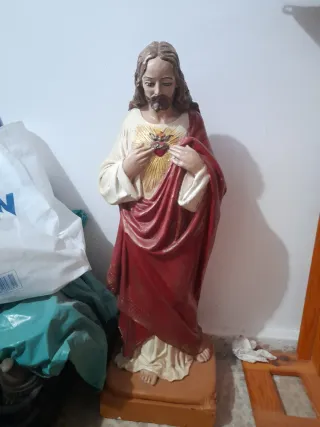 Figura grande del Sagrado Corazón de Jesús, realizada en escayola y pintada a mano. Medidas: 67 cm. de altura x 47 cm. de ancho x 17 cm. de fondo Pieza con más de 30 años de antigüedad, reparada y restaurada en las manos y en el manto tal y como se aprecia claramente en las detalladas fotografías. IMPORTANTE: Debido a la posición de los brazos y a su peso (6 kg), ésta frágil escultura se embalará y protegerá debidamente y de forma gratuita para llevarla al transportista. Precio NO negociable. Gracias.