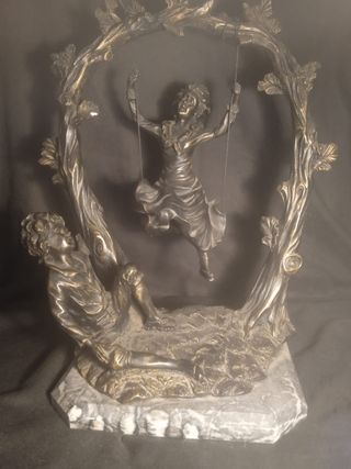 Preciosa escultura decorativa de una pareja, él sentado y ella en un columpio., descansa sobre una base de mármol. Figura / escultura retro vintage de pareja en el columpio.,.muy detallada y preciosa .,.el columpio se mueve ..es de escayola y tiene una base de marmol mide unos 42 de alto x 35 de ancho..(tiene un pequeño descascarillado en una parte de la hoja VER FOTOS) .,.,recogida metro el carmen