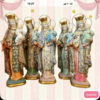 Figura de la Virgen del Carmen realizada en escayola con técnica de decoupage, a mano. Presenta detalles en en dorado. Mide 32cm. Ideal para regalo de pedida de mano y para Comuniones - Diseño floral multicolor.