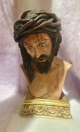 FIGURA O ESTATUA DEL CRISTO DE MEDINACELI Imagen religiosa de escayola 33 cm Estatua del Cristo de Medinaceli de 33 cm de altura en escayola. Pintada a mano. Muy realista. Sin potencia. No estoy segura de su fecha, diría que principios del siglo XX. La figura evoca el momento de la Pasión de Jesús cuando Poncio Pilatos lo presenta al pueblo, conocido como Ecce Homo. La talla original data del siglo XVII, de 1,73 m de altura, realizada en Sevilla y atribuida al taller de Juan de Mesa. También entrego en mano en Sevilla capital y provincia (Consultar) Descuentos por lotes DISPONGO DE MÁS FIGURAS