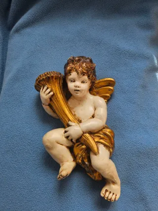Figura decorativa de angelote en escayola con detalles dorados. - Material: Escayola. - Acabado: Dorado y blanco. - Tamaño: 29cm de alto