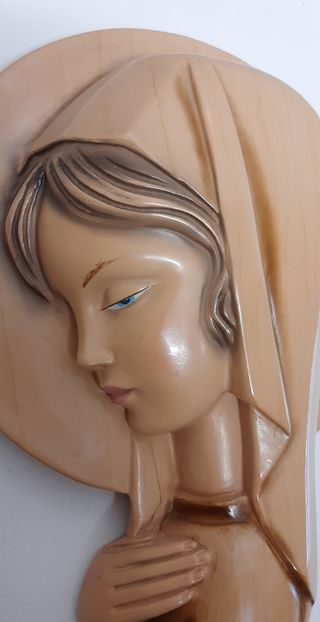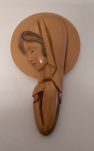 Figura de escayola de la Virgen niña, para colgar en la pared. Mide 28 cm de altura, 16 de ancho y 6 cm de fondo. Pesa unos 700 gr. Es antigua, de los años 70, pero está en perfecto estado.