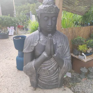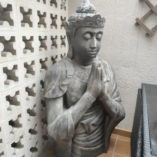 Oferta precio negociable. Figura decorativa de Buda en posición de oración, elaborada en fibra. - Diseño detallado. - Apto para exteriores.