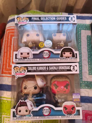 Dos paquetes de figuras Funko Pop! de Demon Slayer. - Paquete 1: Final Selection Guides (2 figuras). - Paquete 2: Tanjiro Kamado & Sakonji Urokodaki (2 figuras), Edición Limitada Summer Convention 2023. - Figuras de vinilo. - Licencia oficial de Demon Slayer.