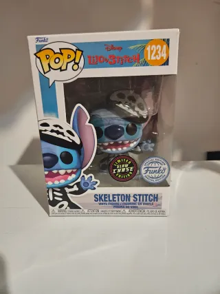 Figura coleccionable de Skeleton Stitch de Disney, número 1234. La caja esta rota por un lado. - Edición especial Glow Chase Edition. - Figura de vinilo. - Incluye sello Special Edition de Funko.