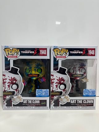 ✅En muy buenas condiciones, tal como puedes ver en las fotos. Si necesitas más imágenes, ¡no dudes en pedírmelas! 🎁Incluye protector de regalo ☀️Siempre guardados en vitrina, sin exposición al sol y en hogar libre de humo 📦Envío muy bien protegido con papel de burbuja y caja reforzada 🤡🔪 Funko Pop Art the Clown #1948 – Terrifier (Bundle Chase + Regular) Bundle que incluye la versión Regular y la Chase de Art the Clown, el icónico villano de la saga Terrifier. Un set imprescindible para coleccionistas de terror, con una de las figuras más buscadas del cine gore actual.