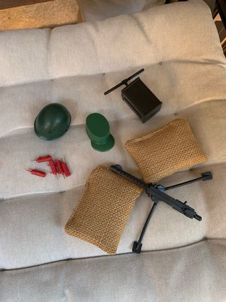 lote accesorios para figuras tipo geyperman 1/6 - Casco verde. - Gorra verde. - Dinamita (4 unidades). - Caja negra con palanca. - Ametralladora con trípode. - Dos sacos de arpillera.