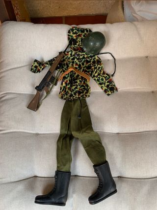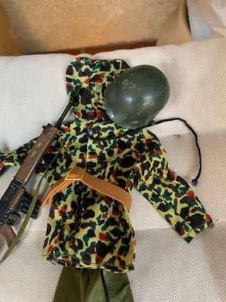 uniforme soldado válido para geyperman y otras figuras - Casco verde. - Chaqueta y pantalón con estampado de camuflaje. - Cinturón marrón. - Botas verdes. - Arma de juguete.