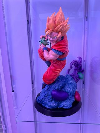 Figura coleccionable de Son Goku en su transformación Super Saiyan. - Diseño inspirado en el personaje de Dragon Ball. - Incluye dos espadas. - Base negra con detalles. - Colores vibrantes y detallado esculpido.
