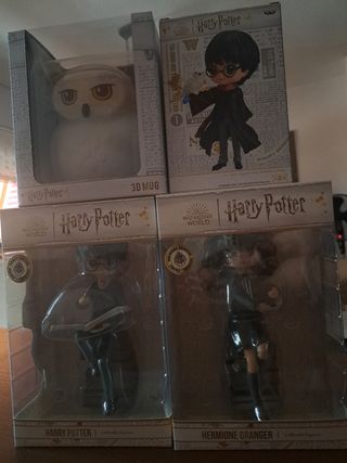 Pack de coleccionables de Harry Potter, ideal para fans de la saga. - Figura coleccionable de Harry Potter Plastoy sentado en pila de libros. - Figura coleccionable de Hermione Granger Plastoy sentada en pila de libros - Taza 3D con diseño de Hedwig - Figura Q Posket Harry Potter.