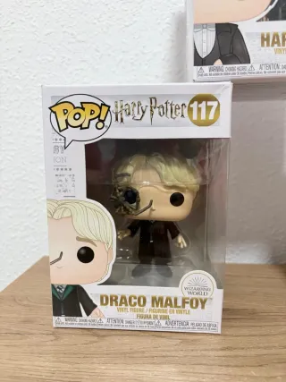 Figura Funko Pop de Draco Malfoy de la saga Harry Potter. - Número de figura: 117 - Diseño inspirado en la película. - Caja con diseño de periódico mágico.