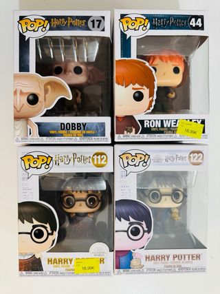 Lote de 4 figuras Funko Pop de la saga Harry Potter. - Funko Pop Dobby (nº 17) - Funko Pop Ron Weasley (nº 44) - Funko Pop Harry Potter (nº 112) - Funko Pop Harry Potter (nº 122)