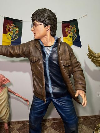 Figura a tamaño real de Harry Potter de algo menos de 170cm, la base mide unos 15cm de alto, La figura tiene todos los detalles del personaje de las películas, la varita y las gafas son complementos reales consiguiendo mayor realismo, figura perfecta para decoración de tiendas y locales