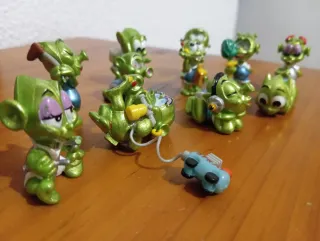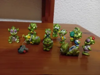 Colección de figuras de once marcianos de los huevos Kinder de los años 90. Son de color verde brillante y tienen diseños divertidos. Tres de ellos con movimiento en los ojos. - Figuras de plástico. - Coleccionables de los 90.