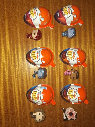 2 euros cada figura Funko Pop de Stranger Things, provenientes de huevos Kinder. - Incluye figuras de personajes de la serie. - Diseños detallados y coloridos.