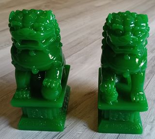 Pareja Lote de Leones Dragones Chinos Foo . Fu . Simbolizan la protección y la prosperidad , actuando como guardianes contra espíritus malignos y energías negativas. Se presentan en parejas de macho y hembra, que representan la dualidad del yin y el yang . Preciosos , incluye el macho y la hembra . Fabricados en resina dura imitación jade . Tienen de altura 11 cm y cada figura pesa 260 gramos . NUEVOS a estrenar solo se sacaron de la caja para hacer las fotos . perros , dragones .