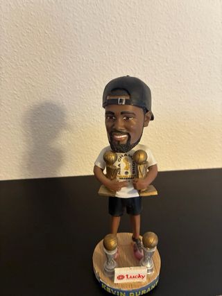 Figura coleccionable de Kevin Durant, jugador de baloncesto. - Diseño tipo bobblehead. - Incluye trofeos de campeón y MVP de las finales - Base con nombre del jugador. -Sin caja