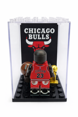 Exhibición de coleccionista de Michael Jordan con los Chicago Bulls. - Figura tipo brick de Michael Jordan. - Incluye trofeo y balón de baloncesto. - Fondo con logo de los Chicago Bulls.