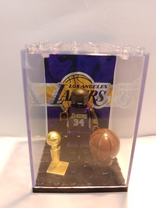 Colección de edición de lujo de Brick de los Lakers con la figura de Shaquille O'Neal. - Figura de Shaquille O'Neal con el número 34. - Incluye trofeo y balón de baloncesto. - Fondo con el logo de Los Angeles Lakers.