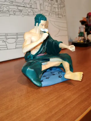 Figura de colección del personaje Zoro de One Piece, representando una pose de meditación. - Figura de plástico. - Detalle de cicatrices y vendas. - Viste una túnica verde.