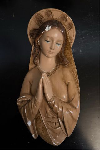 Figura decorativa de la Virgen María en actitud de oración, con elementos del Nacimiento. - Diseño detallado. - Tonos tierra. Precios: Virgen 40 euros Pesebre 20 euros