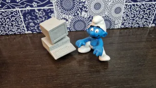 Figura decorativa de un Pitufo. Ideal para coleccionistas o fans de los Pitufos. - Pitufo azul con gorro blanco. - Sentado en un flotador amarillo y rojo. - Sostiene un portátil y bebe con una pajita.