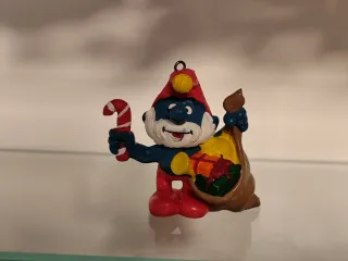 Adorno navideño de un Pitufo con un saco de regalos y un bastón de caramelo. - Figura de Pitufo con gorro rojo y traje azul. - Lleva un saco de regalos en la mano. - Sostiene un bastón de caramelo a rayas rojas y blancas.