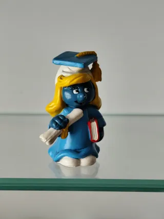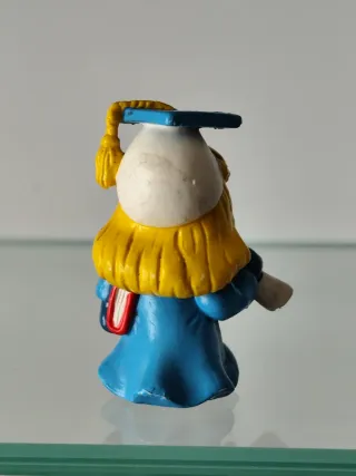 Figura de pitufo con toga y birrete, lista para celebrar un logro académico. Sostiene un diploma enrollado y un libro. - Pitufo con vestido azul y detalles dorados. - Gorro de graduación azul con borla. - Diploma enrollado blanco. - Libro rojo.