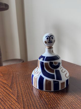 Figura decorativa de cerámica con un diseño abstracto y colorido. - Diseño con rostro y cuerpo estilizado. - Motivos geométricos en azul y marrón.
