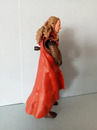 Figura de acción del Rey Theoden de El Señor de los Anillos. En buenas condiciones. - Detallada armadura dorada y roja. - Incluye espada. - Fabricada por Toy Biz.