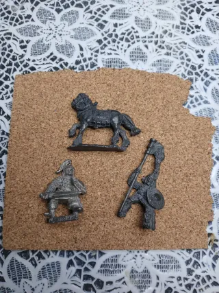 Lote de figuras de metal para juegos de rol o coleccionismo, inspiradas en el universo de El Señor de los Anillos y Warhammer. - Incluye un caballo y dos guerreros. - Detalladas figuras de metal.