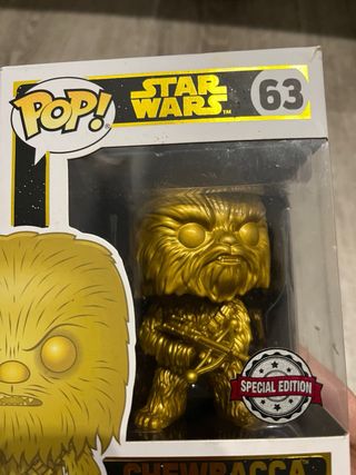 Figura coleccionable Funko Pop Chewbacca de Star Wars, edición especial. NO NEGOCIABLE. - Número de figura: 63. - Diseño metálico dorado. - Incluye caja original.