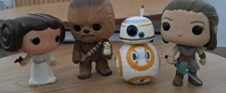 Lote de 4 figuras Funko Pop de Star Wars. Incluye a Leia, Chewbacca con Porg, BB-8 y Rey. - Figuras coleccionables de vinilo. - Personajes icónicos de la saga Star Wars.