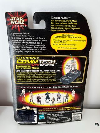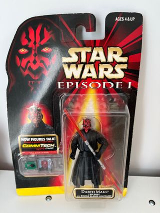 Figura de acción de Darth Maul de Star Wars: Episodio I. - Incluye sable de luz de doble hoja. - Compatible con chip CommTech para figuras que hablan. - Empaque original.