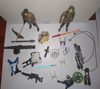 Lote de accesorios y 2 figuras de STAR WARS. Accesorios varios, una figura de un piloto, y una figura de un Jedi con su espada laser, creo que de STAR WARS Rebels. Articulaciones duras, apenas usados. Lo de las fotos. Mira mis otros articulos para ahorrar. Combino envios