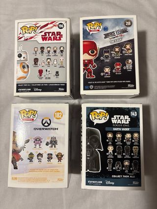 Conjunto de 4 figuras Funko Pop mantenidas en su caja desde siempre. - Funko Pop Star Wars BB-8 #196 - Funko Pop Justice League The Flash #208 - Funko Pop Overwatch McCree #182 - Funko Pop Star Wars Rogue One Darth Vader #143 Unidad a 7€ Los 4 juntos 20€