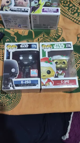 Dos figuras Funko Pop! de Star Wars. - Figura K-2SO, número 179, de Rogue One. - Figura C-3PO, número 276, con temática navideña. - Ambas figuras son exclusivas de convención.