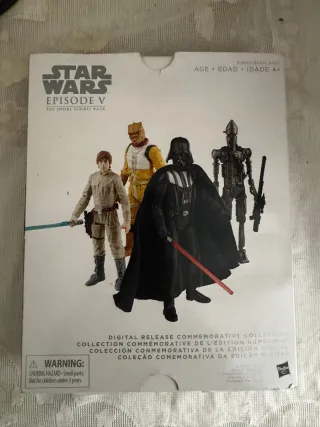 Colección de figuras conmemorativas de Star Wars: Episodio V - El Imperio Contraataca. Edición digital. - Incluye figuras de Luke Skywalker, Darth Vader, Chewbacca y un droide. - Edad recomendada: 4+ años. - Advertencia: Contiene piezas pequeñas, no apto para niños menores de 3 años.