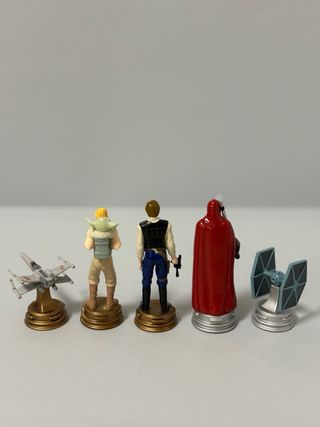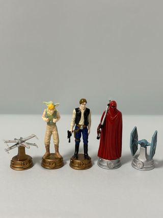 Conjunto de figuras coleccionables de Star Wars, con licencia oficial de Lucasfilm. Figuras -Luke Skywalker con Yoda -Han Solo -Nave TIE Fighter (Imperio Galáctico) -Guardia Real del Emperador -Nave X-Wing (Alianza Rebelde) Características -Año: 2010 -Material •Figura: resina/plástico duro •Base: plástica con acabado mate