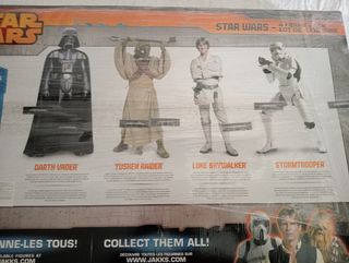 Set de 4 figuras de acción Star Wars de Jakks Pacific. Son figuras grandes, de más de 45cm. Incluyen Darth Vader, Tusken Raider, Luke Skywalker y Stormtrooper. Cada figura tiene 7 puntos de articulación. Están en su caja original, que presenta algunos signos de desgaste por almacenamiento.