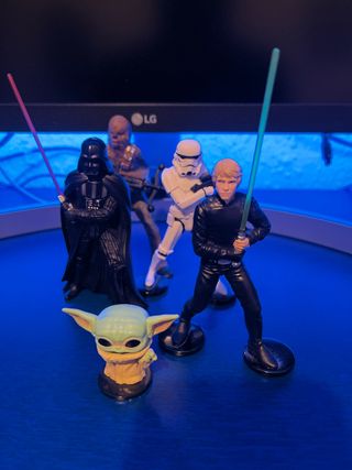 Set de figuras de Star Wars en estupendo estado. Son perfectas para cualquier fanático de la saga. - Incluye 5 figuras: Darth Vader, Luke Skywalker, un Stormtrooper, Chewbacca y Grogu (The Child). - Las figuras son pequeñas y detalladas. - Ideales para coleccionistas o para jugar.