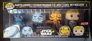 Pack de 4 figuras Funko Pop! de Star Wars. - Incluye Darth Vader, Stormtrooper, C-3PO y Luke Skywalker. - Figuras tipo bobble-head. - Edición exclusiva Only At Target.