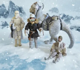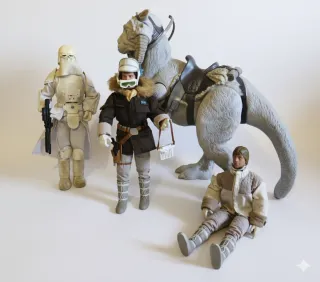 Colección de figuras de Star Wars ambientadas en Hoth. Consulta precio de la figura de tu interés. - Figura de soldado imperial. - Figura de Han Solo. - Figura de Luke Skywalker. - Tauntaun con silla de montar.