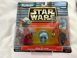 Colección de playsets transformables de Star Wars Micro Machines, serie VI. - Incluye figuras de Royal Guard, 2-1B y Weequay. - Contiene playsets con temática de Star Wars. - Producto de la marca Galoob.