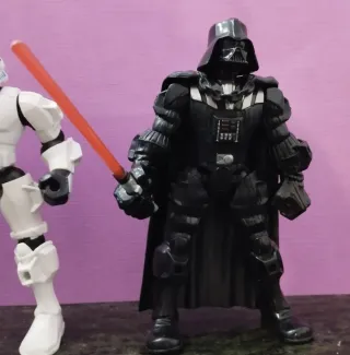 Dos figuras de acción de Star Wars, un Stormtrooper y Darth Vader. El Stormtrooper es blanco con detalles negros y el Darth Vader es negro con detalles plateados y capa. - Figura de Stormtrooper. - Figura de Darth Vader. - Incluye sable de luz rojo.