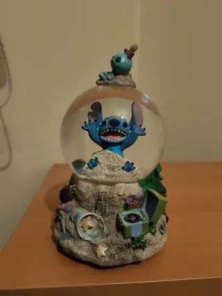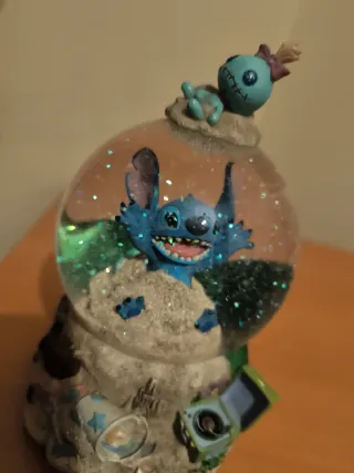 Bola de cristal decorativa con personajes de Lilo y Stitch. Incluye una pequeña figura de Stitch en la parte superior y otro Stitch dentro de la esfera. - Diseño temático de Lilo y Stitch. - Figura superior de Stitch. - Esfera con figura de Stitch y detalles. - Base decorada con elementos de playa y música.