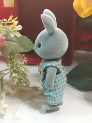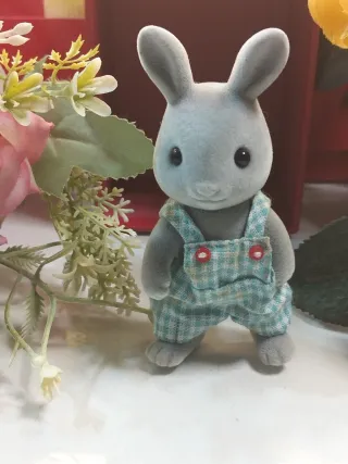 Figura de conejo de la colección Sylvanian Families el hermano con su ropa origina. Tiene una flor rosa en la cabeza Métete a mi perfil para ver más sylvanian Solo intercambio por cosas de sylveon de Pokémon