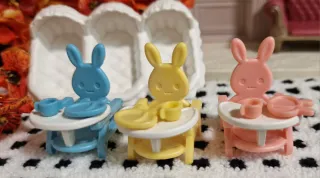 Set de tres adorables tronas para bebés con figura de conejito. - Triciclo azul con taza y plato. - Triciclo amarillo con taza y plato. - Triciclo rosa con taza y plato. - No trae caja de origen. para sylvanian families o casas de muñecas, forest famili, calico critter, ternurines. Puedo quedar pero pago en efectivo ( No bizum) Ideal para navidad, año nuevo, reyes, cumpleaños o para darte un gusto en coleccionar. Regalo presente Silvania sylvan